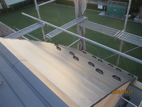 水掛調査、仮設足場、既存屋根材撤去、屋根下地増し貼り、ルーフィング2重貼り、新規屋根材葺き、確認の為の完成後水掛調査 工事日数=4日間 |
