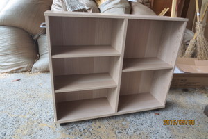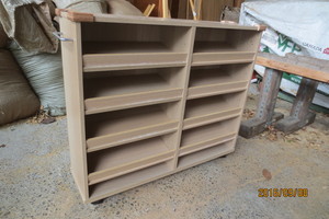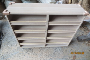 初めは製材された材木で製作しようと思ったのですが、カットされた材料をホームセンターで見ていたところ、使用する材料費だけで¥12,000−ほど掛かることが解ったので、基本の形は既製品を使用し、棚板のみ追加購入して加工、製作しました。