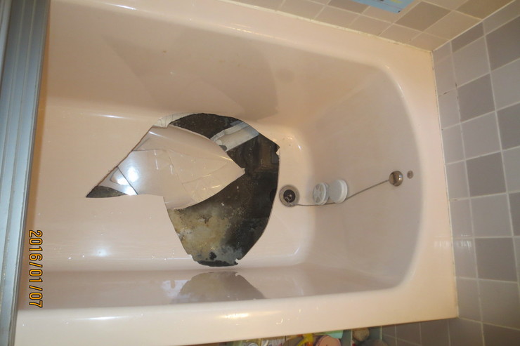 | 依頼のきっかけ | 子どもと入浴しようとして湯船に入ったところ突然、バキという音とともにお湯が抜けてしまった。最初は何が起きたかわからずに唖然としたが見ると浴槽の底が大きく抜けてしまっていた。 |